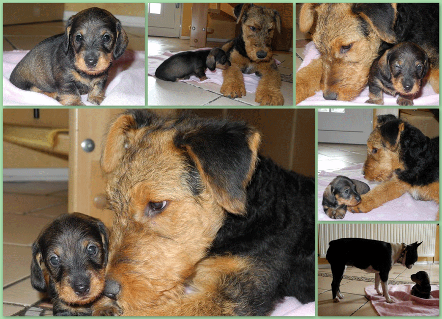 Fast 4,5 Wochen und die Sozialisierungsphase beginnt !!! Um meine Welpen gleich von Anfang gut auf den Kontakt zu großen und anderen Hunden vorzubereiten, werden sie nunmehr nach und nach Bekanntschaft mit unseren großen Hausgenossen machen. Dies ist für mich sehr wichtig, da ich viel Wert auf ein gutes Sozialverhalten legen. Den Anfang machte heute Ikone (gen. Ikke). Wie die Bilder zeigen, war unsere Zora (4,5 Monate junge Airdaile-Terrier-Hündin) zu Anfang wenig begeistert - ihr Blick spricht Bände: "Ich will dochmal ein Diensthund werden und nicht Babysitten." Aber unsere Ikke war völlig unbeeindruckt und hat sich ganz lieb angekuschelt. Zum Schluss hat natürlich wie immer der Charme der Dackel gesiegt .... wie das letzte Foto so schön Augenzwinkernd beweist. |
